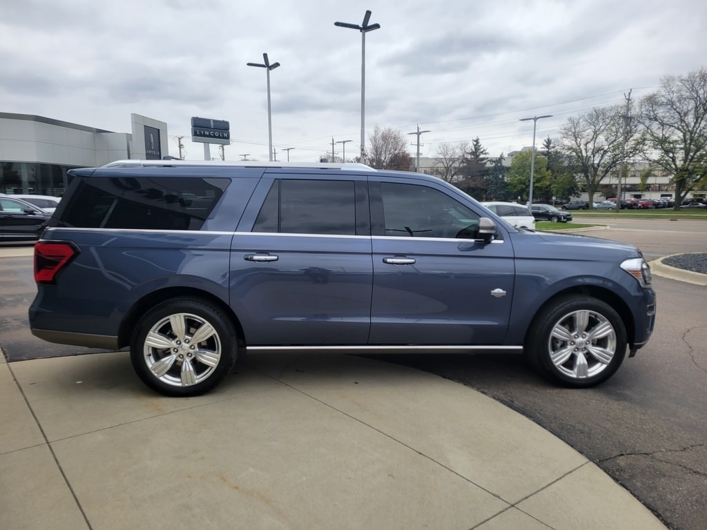 Experience premium power and luxury with this Blue 2022 Ford Expedition MAX 4x4 King Ranch SUV. Perfect for families or anyone needing serious space, this Expedition MAX offers top-tier comfort and advanced technology. Enjoy the panoramic moonroof, heated and ventilated premium leather seats, and the Bang & Olufsen 21-speaker sound system. The huge 15.5-inch infotainment screen supports wireless Apple CarPlay and Android Auto, while the customizable 12.4-inch digital instrument cluster keeps you informed. Safety is paramount with adaptive cruise control, lane keeping assist, intersection turn automatic emergency braking, surround view cameras, and rear cross-traffic alert. The third row features power folding for flexible cargo and seating, and power retractable running boards add convenience. Towing is a breeze with a heavy-duty trailer tow package and Class IV hitch. Whether it's road trips, daily drives, or hauling, this Expedition MAX King Ranch delivers capability, comfort, and confidence.